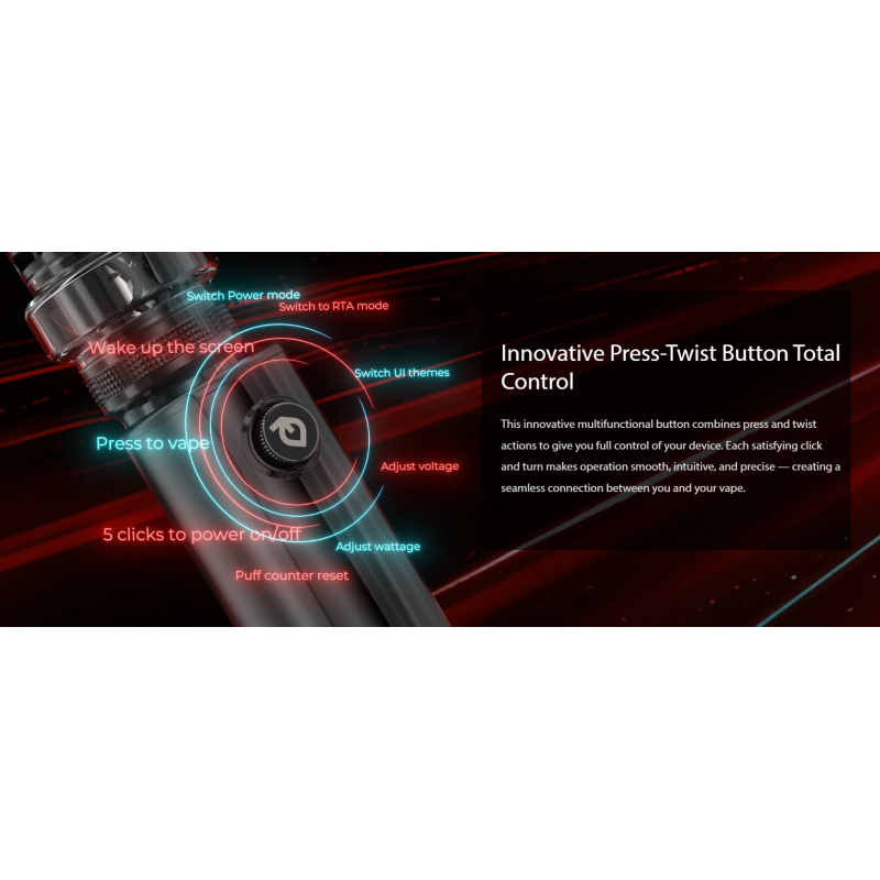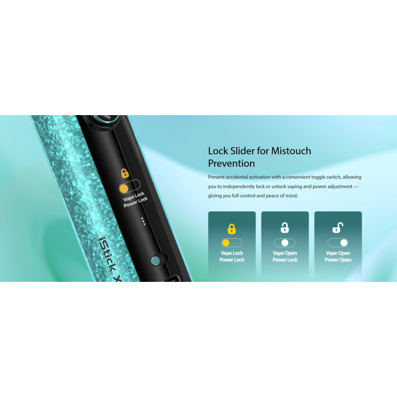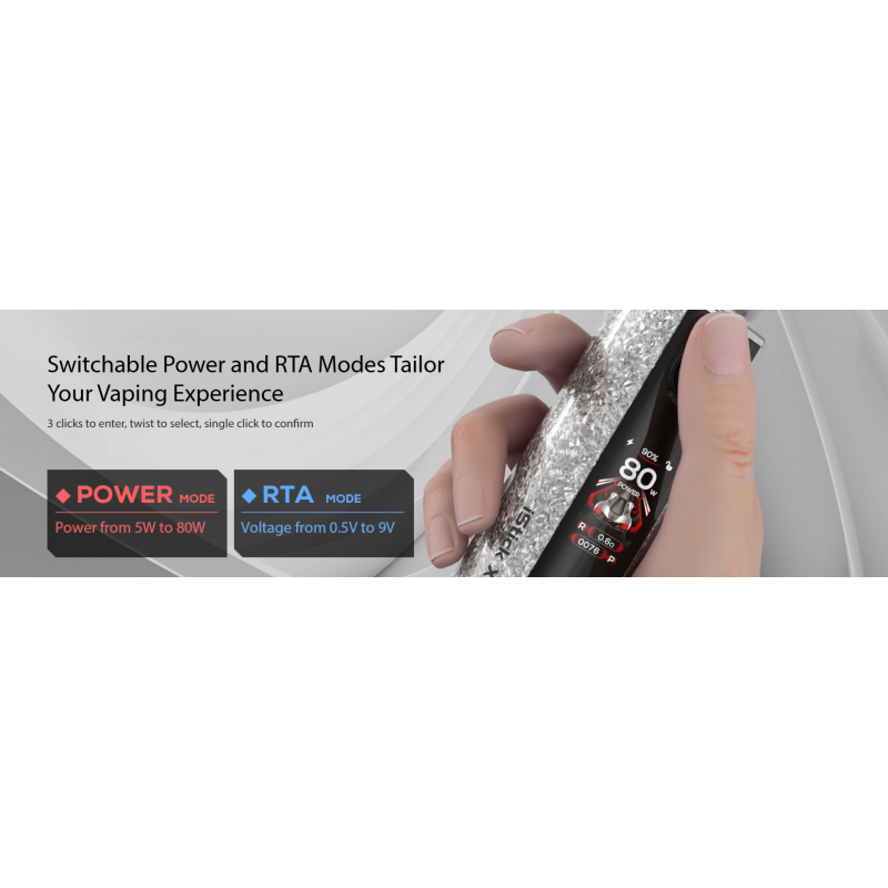 Το iStick XC100 είναι το νέο μοντ της σειράς iStick, σχεδιασμένο για ατμιστές που αναζητούν ισχύ, ασφάλεια και προηγμένη τεχνολογία. Με μέγιστη ισχύ 100W και τον έξυπνο Avatar Chip 2.0, προσφέρει ακριβή έλεγχο και εξατομικευμένη εμπειρία χρήσης. Διαθέτει μεγάλη έγχρωμη οθόνη TFT 1.05” με τέσσερα δυναμικά θέματα (Racer, Bubbles, Pulse, Aurora) και καινοτόμο Press-Twist Button που συνδυάζει πίεση και περιστροφή για εύκολο και ακριβή χειρισμό. Υποστηρίζει λειτουργίες Power και RTA, ενώ το σύστημα κλειδώματος Vape Lock και Power Lock εξασφαλίζει απόλυτη ασφάλεια και αποφυγή τυχαίας ενεργοποίησης.